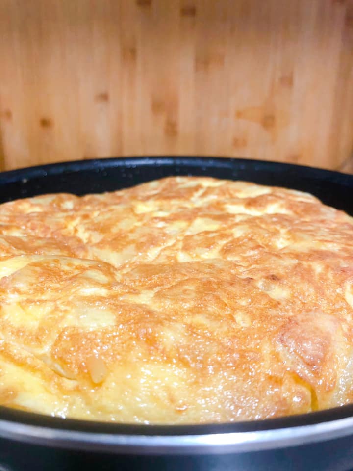 (mover un poco la sartén para que no se pegue la tortilla) cuando se perciba que está cuajada darle la vuelta con un plato grande o una tapa. Se le puede dar vueltas hasta que quede dorada por ambos lados según el gusto…