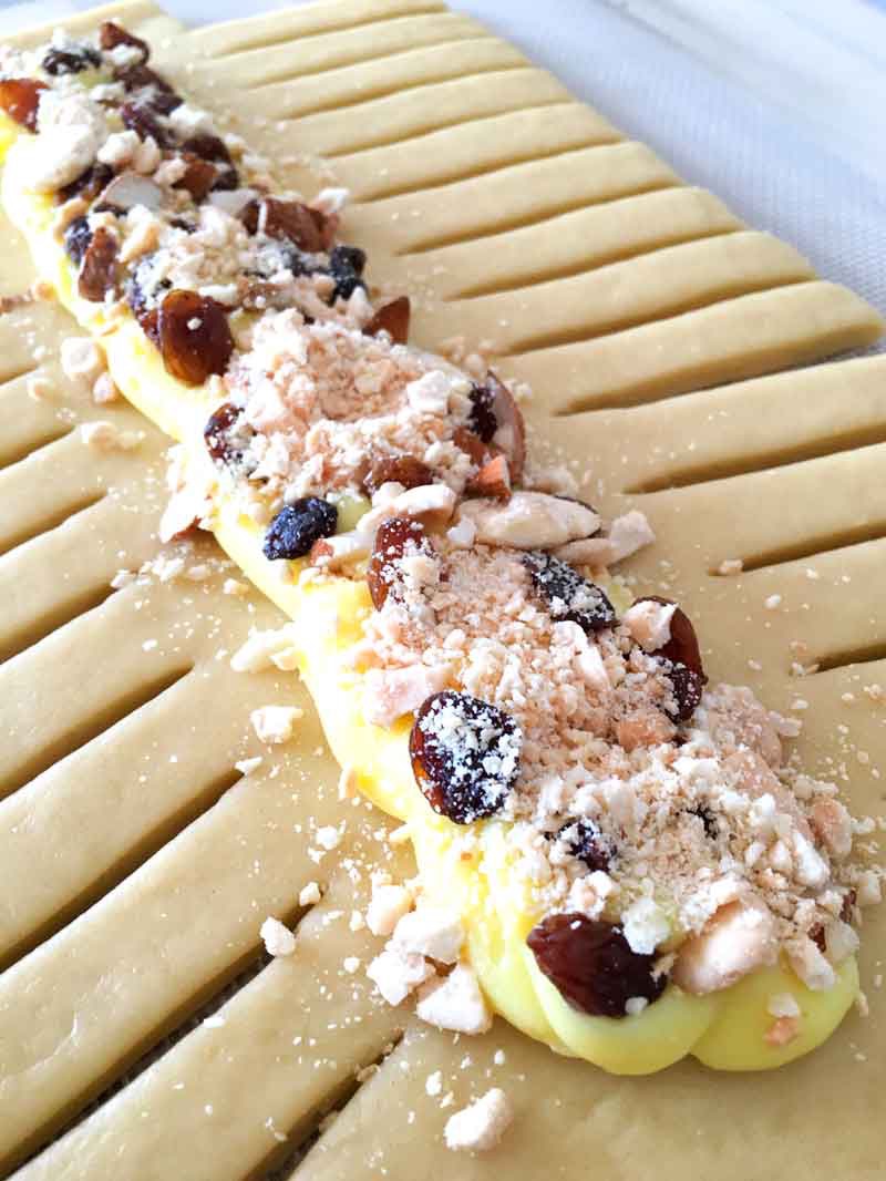 Rellenar la masa primero con la crema pastelera y esparcir encima las pasas y las almendras picadas.