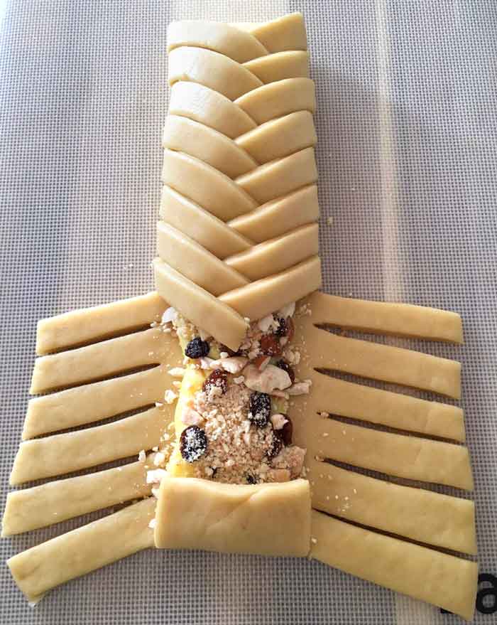 Cerrar la masa como formando una trenza intercalando los trozos de masa entre si.