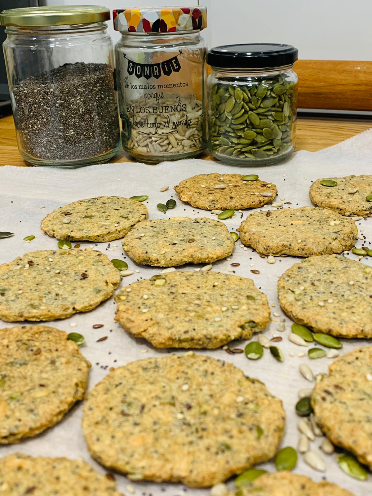 Verter en un bol las semillas de chia y lino e incorporar el agua para que se hidraten ambas semillas (al menos 5 minutos), a continuación añadir la sal, la pimienta, el ajo en polvo, el aceite, las semillas de sésamo y amapola, la harina de trigo sarracenio y las pipas de calabaza y girasol.