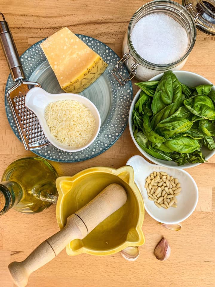Triturar con mortero o procesadora la albahaca, los ajos y los piñones o las nueces hasta conseguir una pasta homogénea. Añadir el aceite de oliva y mezclar para darle a la pasta una consistencia cremosa. Incorporar el resto del aceite poco a poco, en forma de hilo fino, sin dejar de batir para conseguir una emulsión perfecta. Añadir el queso y remueva con una cuchara de madera. Pruebe y añada sal y pimienta si fuera necesario.
